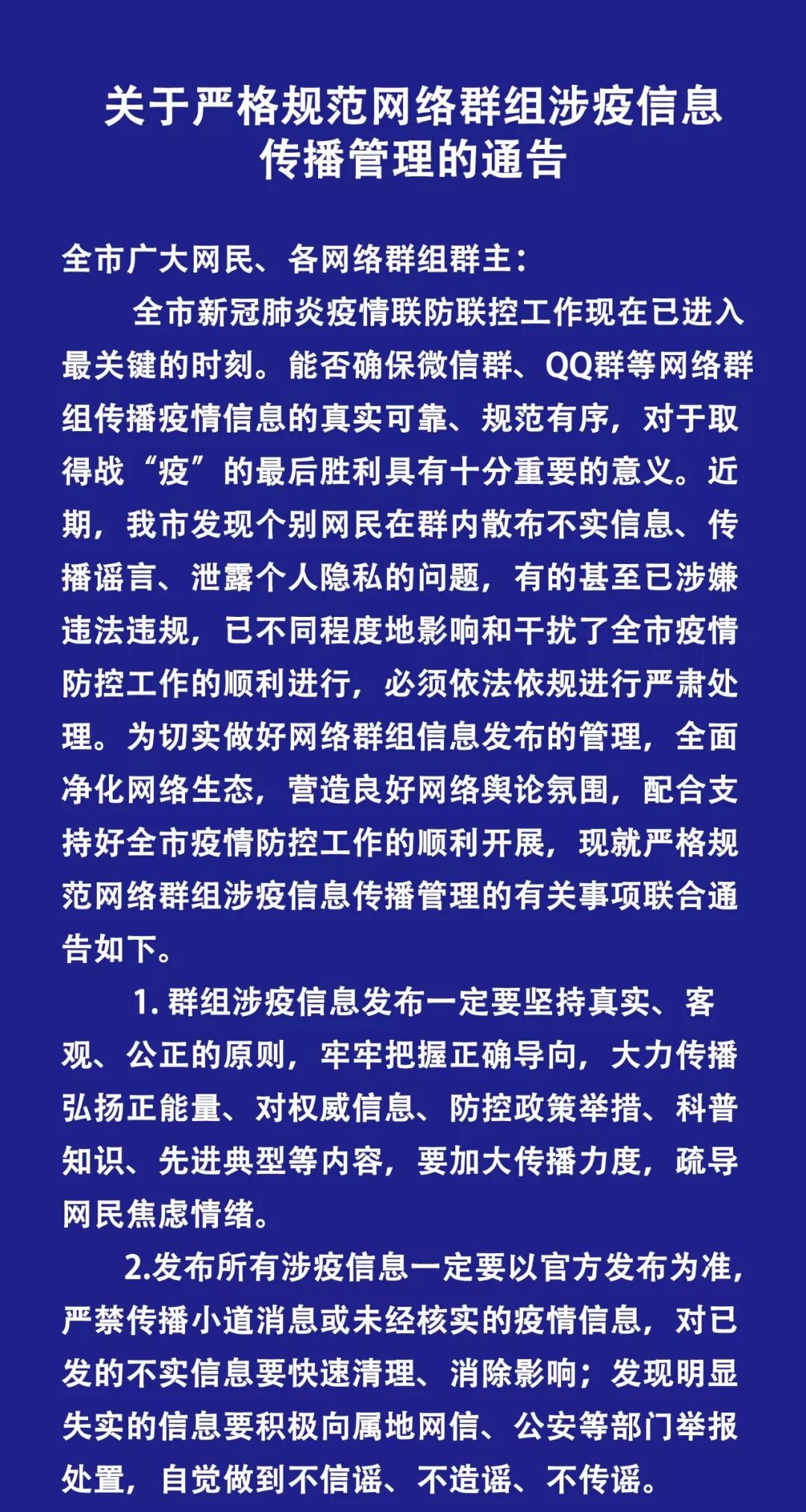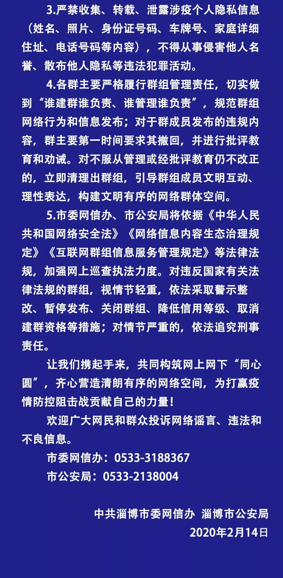 全市廣大網(wǎng)民、各網(wǎng)絡(luò)群組群主: 全市新冠肺炎疫情聯(lián)防聯(lián)控工作現(xiàn)在已進(jìn)入最關(guān)鍵的時(shí)刻。能否確保微信群、QQ群等網(wǎng)絡(luò)群組傳播疫情信息的真實(shí)可靠、規(guī)范有序,對(duì)于取得戰(zhàn)“疫”的最后勝利具有十分重要的意義。近期,我市發(fā)現(xiàn)個(gè)別網(wǎng)民在群內(nèi)散布不實(shí)信息、傳播謠言、泄露個(gè)人隱私的問題,有的甚至已涉嫌違法違規(guī),已不同程度地影響和干擾了全市疫情防控工作的順利進(jìn)行,必須依法依規(guī)進(jìn)行嚴(yán)肅處理。為切實(shí)做好網(wǎng)絡(luò)群組信息發(fā)布的管理,全面凈化網(wǎng)絡(luò)生態(tài),營(yíng)造良好網(wǎng)絡(luò)輿論氛圍,配合支持好全市疫情防控工作的順利開展,現(xiàn)就嚴(yán)格規(guī)范網(wǎng)絡(luò)群組涉疫信息傳播管理的有關(guān)事項(xiàng)聯(lián)合通告如下。 1、群組涉疫信息發(fā)布一定要堅(jiān)持真實(shí)、客觀、公正的原則,牢牢把握正確導(dǎo)向,大力傳播弘揚(yáng)正能量,對(duì)權(quán)威信息、防控政策舉措、科普知識(shí)、先進(jìn)典型等內(nèi)容,要加大傳播力度,疏導(dǎo)網(wǎng)民焦慮情緒。 2、發(fā)布所有涉疫信息一定要以官方發(fā)布為準(zhǔn),嚴(yán)禁傳播小道消息或未經(jīng)核實(shí)的疫情信息,對(duì)已發(fā)的不實(shí)信息要快速清理、消除影響;發(fā)現(xiàn)明顯失實(shí)的信息要積極向?qū)俚鼐W(wǎng)信、公安等部門舉報(bào)處置,自覺做到不信謠、不造謠、不傳謠。 3、嚴(yán)禁收集、轉(zhuǎn)載、泄露涉疫個(gè)人隱私信息(姓名、照片、身份證號(hào)碼、車牌號(hào)、家庭詳細(xì)住址、電話號(hào)碼等內(nèi)容),不得從事侵害他人名譽(yù)、散布他人隱私等違法犯罪活動(dòng)。 4、各群主要嚴(yán)格履行群組管理責(zé)任,切實(shí)做到“誰建群誰負(fù)責(zé)、誰管理誰負(fù)責(zé)”,規(guī)范群組網(wǎng)絡(luò)行為和信息發(fā)布;對(duì)于群成員發(fā)布的違規(guī)內(nèi)容,群主要第一時(shí)間要求其撤回,并進(jìn)行批評(píng)教育和勸誡。對(duì)不服從管理或經(jīng)批評(píng)教育仍不改正的,立即清理出群組,引導(dǎo)群組成員文明互動(dòng)、理性表達(dá),構(gòu)建文明有序的網(wǎng)絡(luò)群體空間。 5、市委網(wǎng)信辦、市公安局將依據(jù)《中華人民共和國(guó)網(wǎng)絡(luò)安全法》《網(wǎng)絡(luò)信息內(nèi)容生態(tài)治理規(guī)定》《互聯(lián)網(wǎng)群組信息服務(wù)管理規(guī)定》等法律法規(guī),加強(qiáng)網(wǎng)上巡查執(zhí)法力度。對(duì)違反國(guó)家有關(guān)法律法規(guī)的群組,視情節(jié)輕重,依法采取警示整改、暫停發(fā)布、關(guān)閉群組、降低信用等級(jí)、取消建群資格等措施;對(duì)情節(jié)嚴(yán)重的,依法追究刑事責(zé)任。 讓我們攜起手來,共同構(gòu)筑網(wǎng)上網(wǎng)下“同心圓”,齊心營(yíng)造清朗有序的網(wǎng)絡(luò)空間,為打贏疫情防控阻擊戰(zhàn)貢獻(xiàn)自己的力量! 歡迎廣大網(wǎng)民和群眾投訴網(wǎng)絡(luò)謠言、違法和不良信息。 市委網(wǎng)信辦:0533-3188367 市公安局:0533-2138004 中共淄博市委網(wǎng)信辦