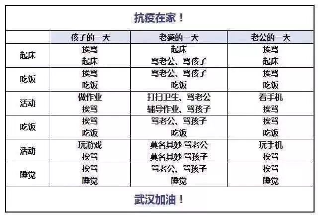 妻子的日常:起床-罵老公、罵孩子,做家務-罵老公、罵孩子,吃飯-罵老公、罵孩子,輔導作業(yè)-罵老公、罵孩子,睡覺-罵老公、罵孩子……